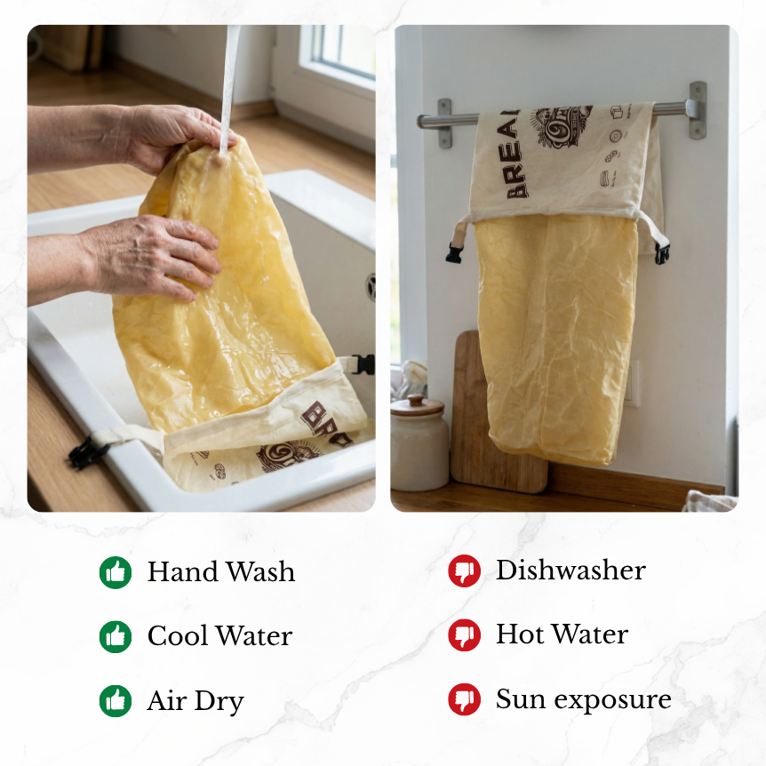 It's super simple! Just wipe it down with a damp cloth and a little mild soap, then air dry. Avoid hot water, as it can melt the beeswax. Treat it right, and your bag will keep your bread amazing for countless bakes.